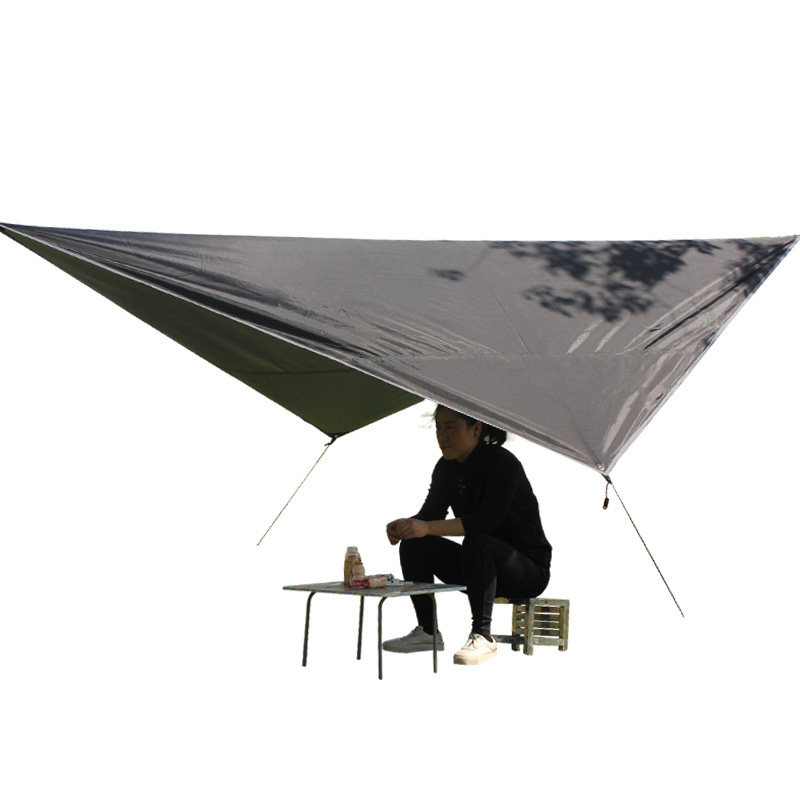 タープは大型の三角形状で広い日陰を作り出し、突然の雨からも守ります。