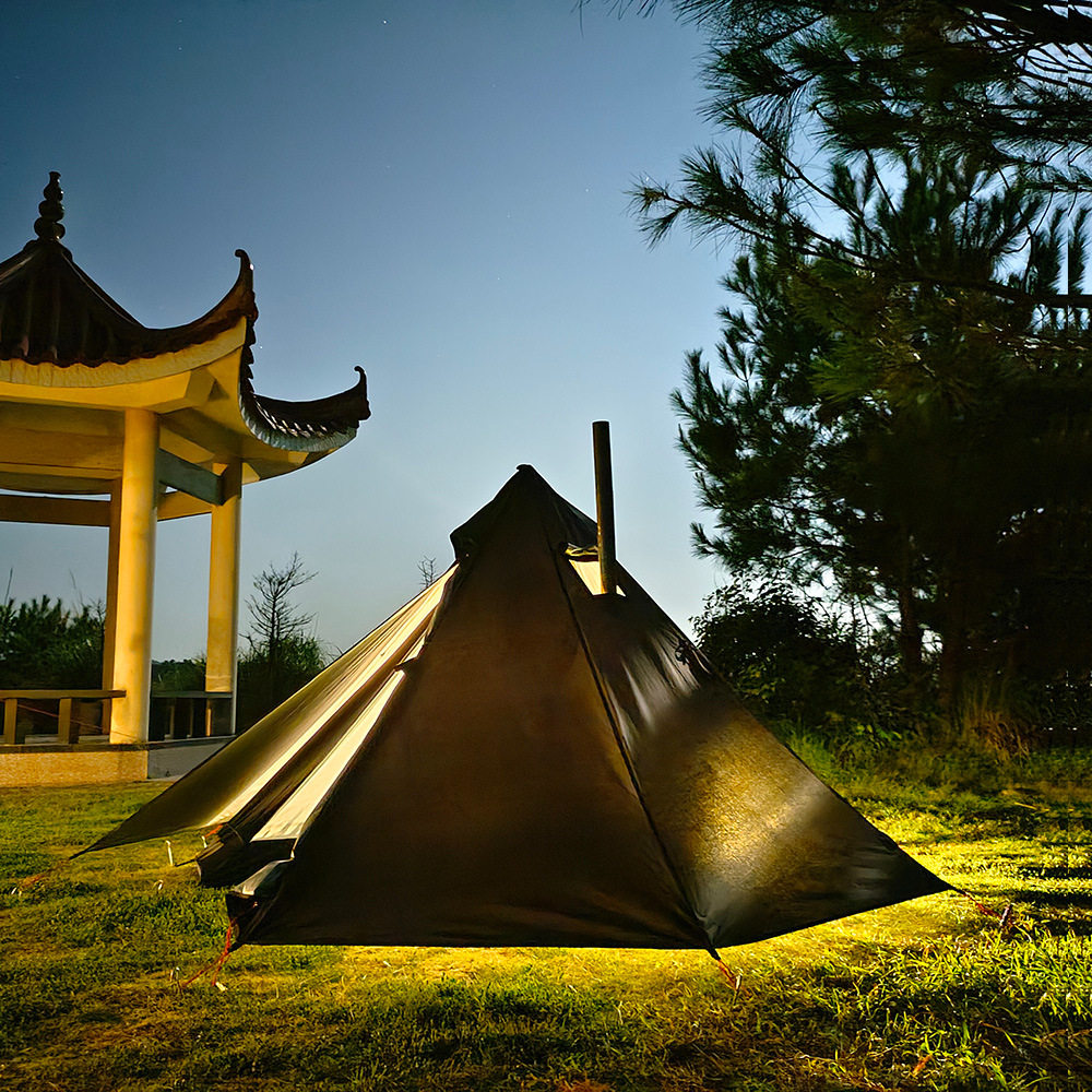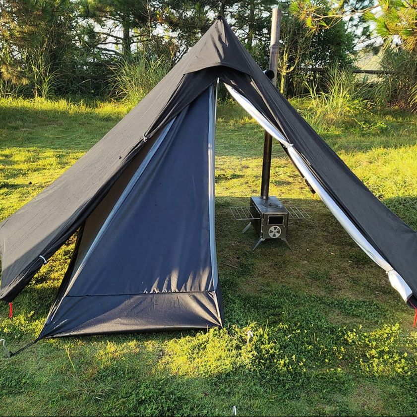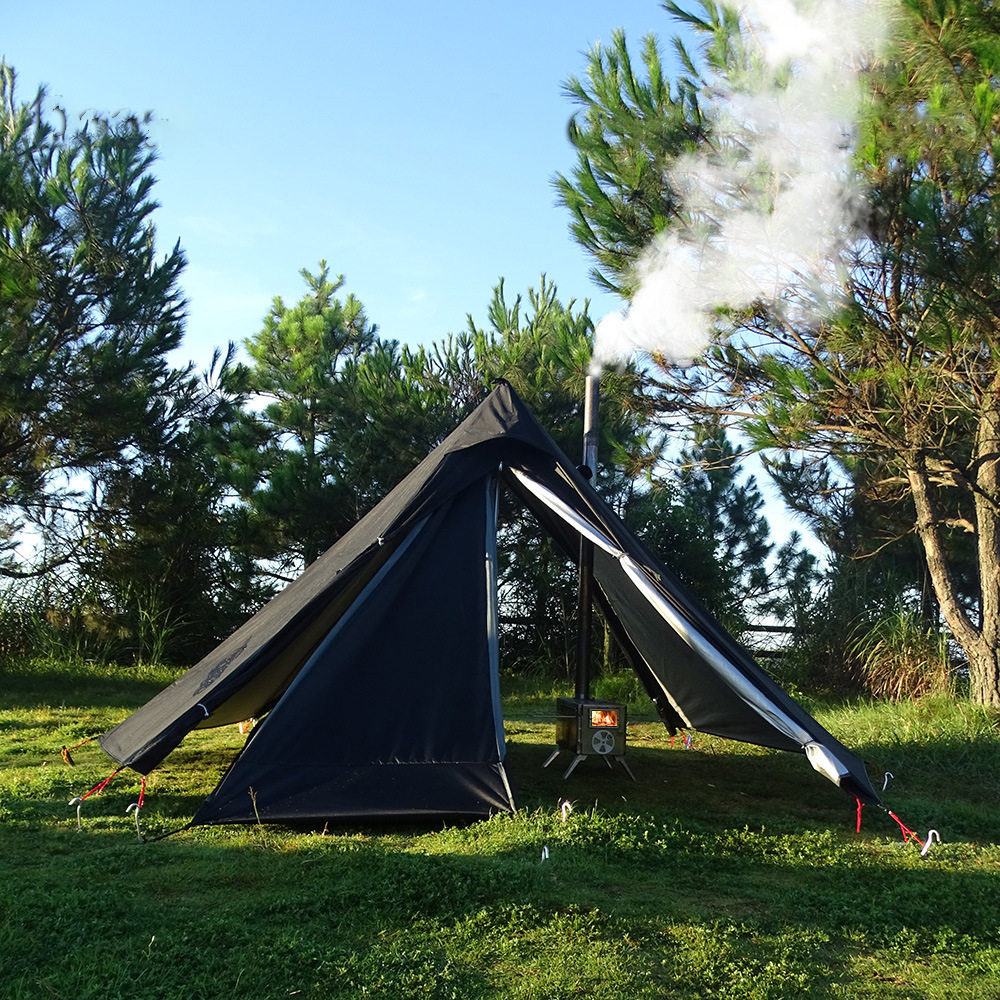 中央にポールを立てるだけで簡単に設営でき、煙突穴付きで薪ストーブも使用可能です。