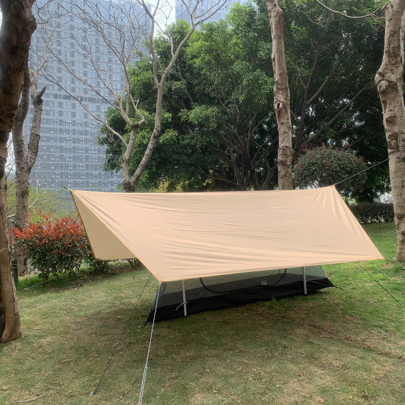 自然の中で快適な空間を作り出すヘキサタープです。 六角形の広々としたデザインで、テントの上部に設置することで強い日差しや雨から居住空間をしっかり守ります。 ロープとペグで簡単に設営でき、キャンプ初心者から上級者まで幅広くお使いいただけるタープです。 耐水性と通気性に優れた素材を使用し、長時間のアウトドア活動でも安心してご利用いただけます。 家族や友人との野外活動を快適にサポートする実用的なアイテムです。