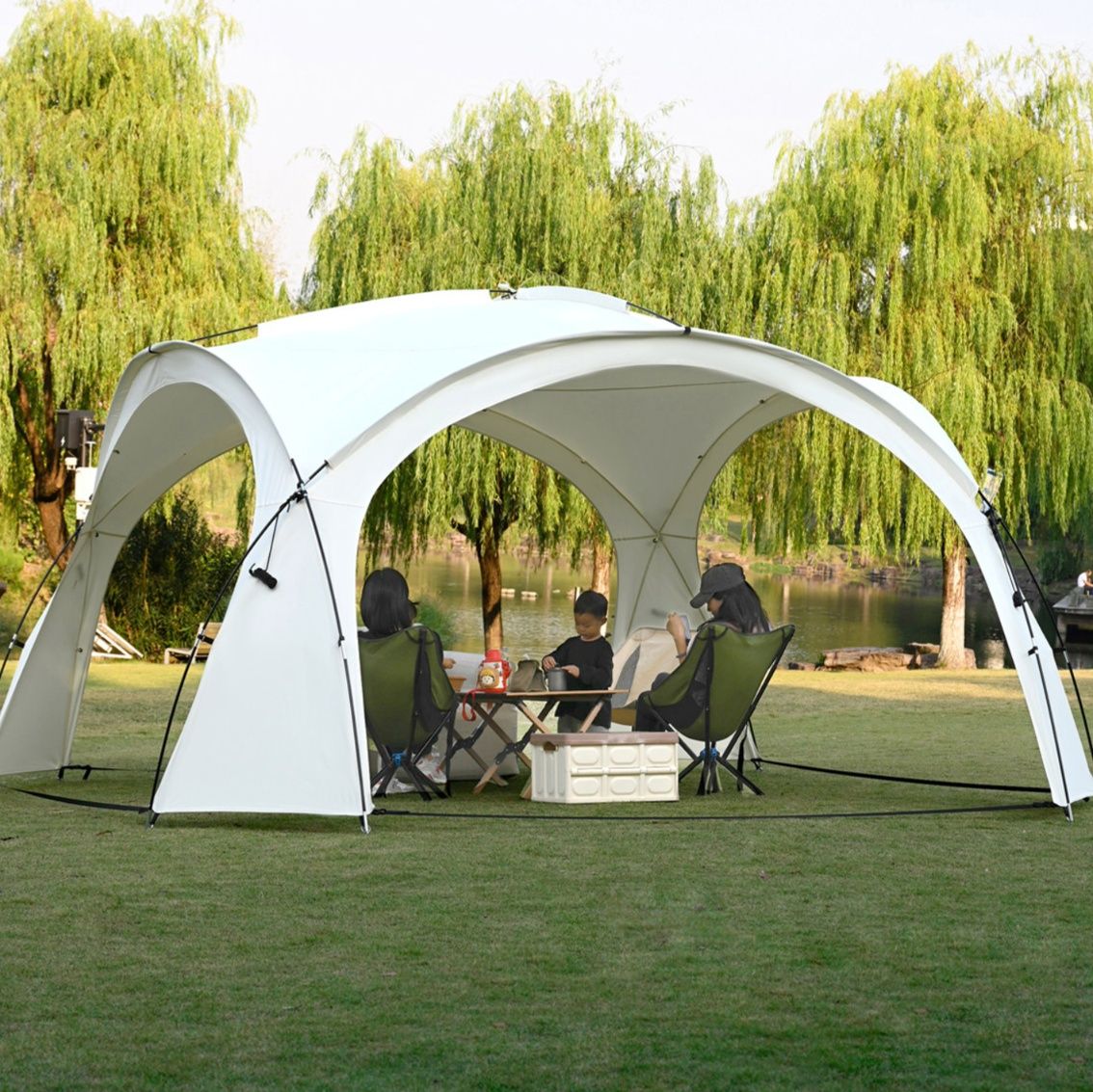 優れた日除けと風通しを両立し、家族や仲間との集まりに最適なタープとなっています。