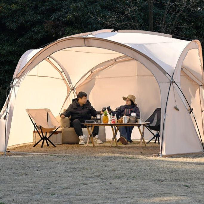広々とした空間を提供する大型のスクリーンタープです。 優れた日除けと風通しを両立し、家族や仲間との集まりに最適なタープとなっています。 曲線を描く独特なドーム構造により、高い居住性と開放感を実現しました。 メッシュパネルを備えた側面は虫の侵入を防ぎながら快適な空気の流れを確保します。 設営も比較的簡単で、野外活動やキャンプでの使用に適した多用途なスクリーンタープです。