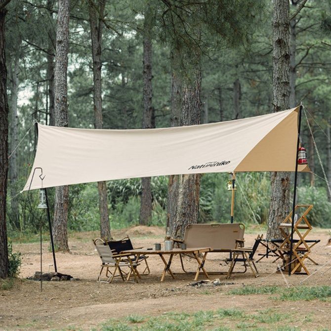 タープとしての基本性能を備えながら、自然に溶け込む仕上がりで野営の雰囲気を高めます。