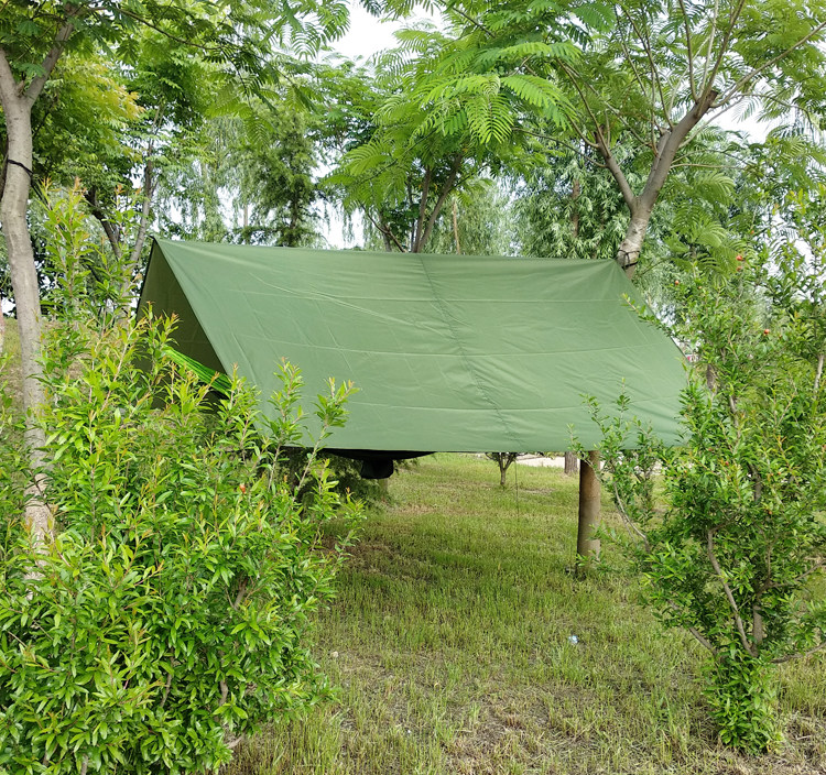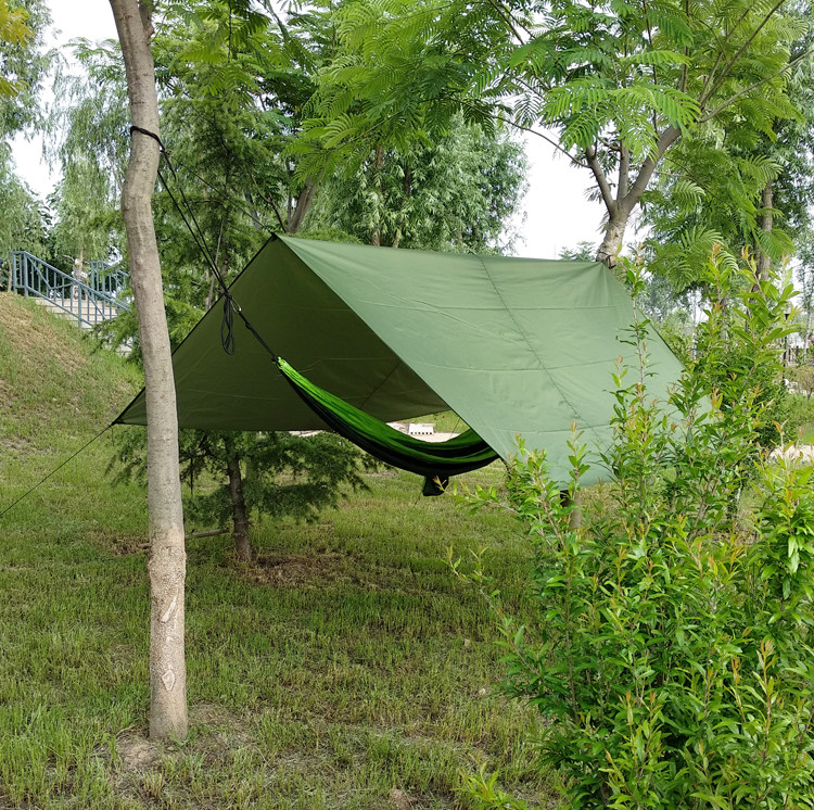 木々の間に簡単に設置できる吊り下げ式の防水タープです。